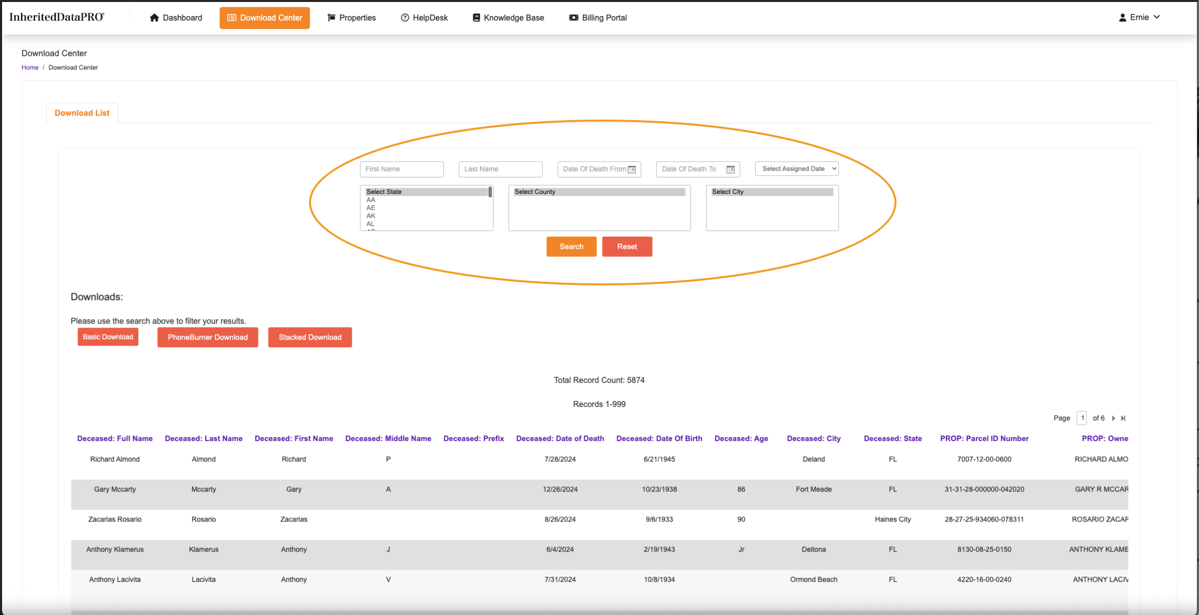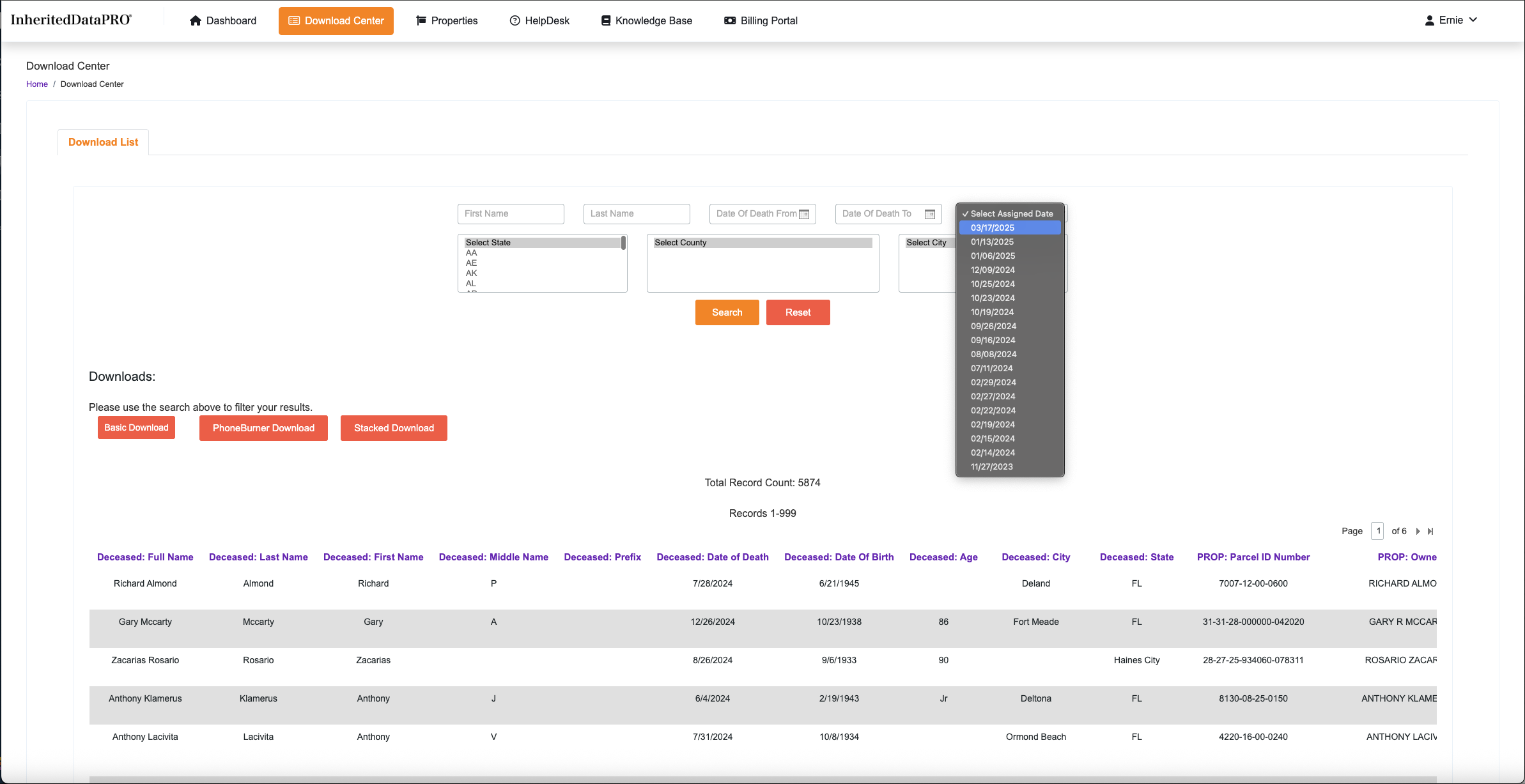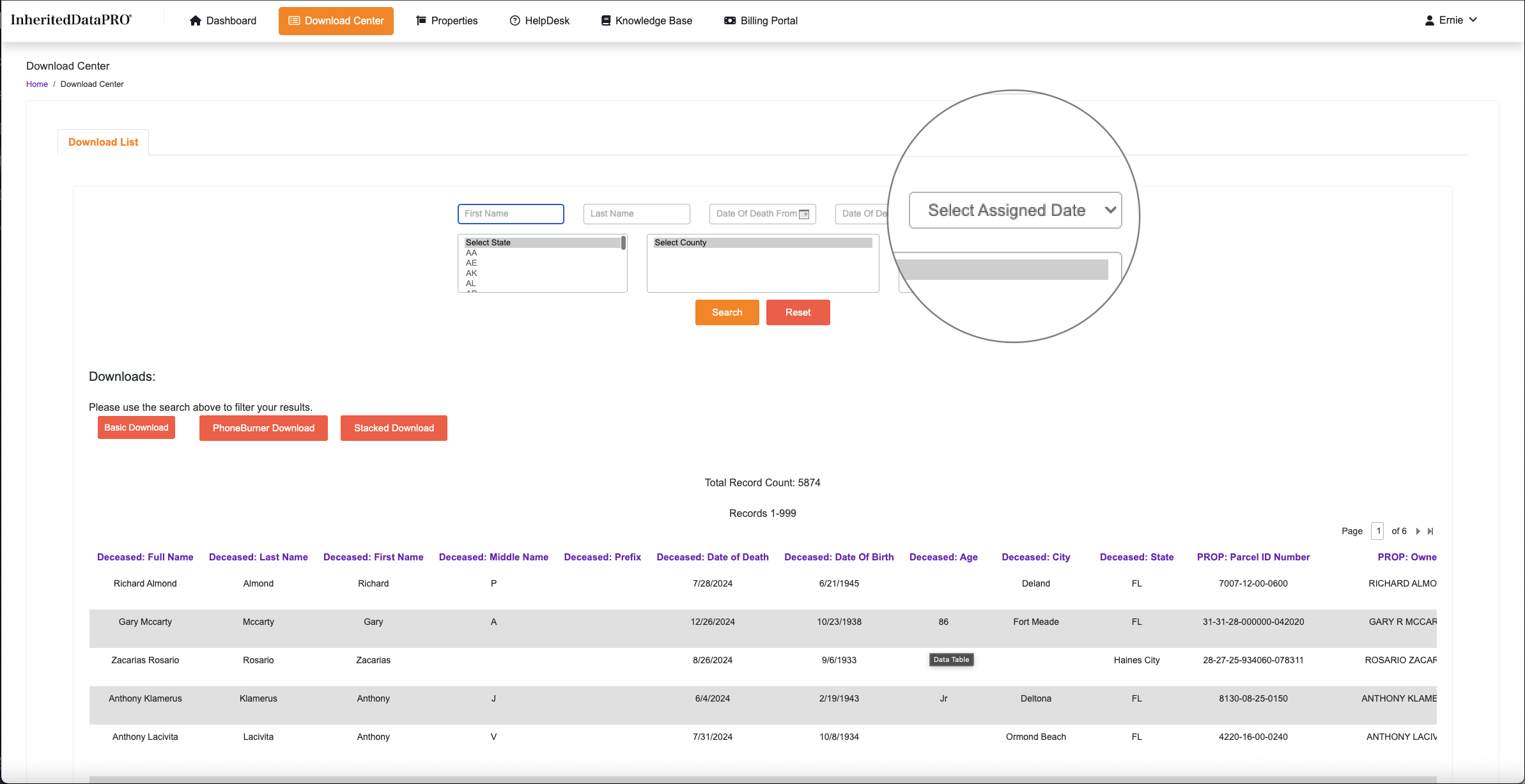 Located in the upper right hand corner of the search selections. This is really the only search you need. The Assigned date is when your InheritedData records are assigned to your Account.